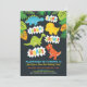 Kids birthday party invitation featuring cute & colourful baby dinosaurs on a dark charcoal background