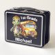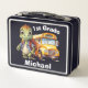 This is a cute lunch box for a boy featuring an adorable dinosaur with his backpack standing in front of a school bus. This lunch box is perfect for your child to carry their lunch to school every day. The text is customisable so you can personalise it to suit your needs.