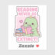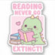 A doodle of a cute dinosaur reading and enjoying a book. The funny caption reads "Reading Never Go Extinct! Adorable doodle for kids that loves to read! ♥