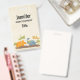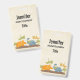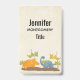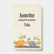 A name tag with a cute design featuring 4 dinosaurs. 2 are flying and 2 are on the ground. Created with watercolors.