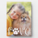 Capture the loving bond of a special dog with a photo display with easel featuring your favourite picture with the overlay title LOVE in cute typography and accented with a paw print and heart in your choice of colours to stand out on your picture. Makes a meaningful gift or keepsake for a child, dog mum, dog dad or family. ASSISTANCE: For help with design modification or personalisation, colour change, resizing or transferring the design to another product, contact the designer BEFORE ORDERING via the Zazzle Chat MESSAGE tab or email makeitaboutyoustore@gmail.com.