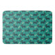 A bath mat designed with a repeating pattern featuring a cute smiling doggy with floppy ears and a dog bone. Green background.