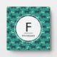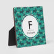 A photo plaque designed with a repeating pattern featuring a cute smiling doggy with floppy ears and a dog bone. Green background. A circle layered over top with a monogram initial and name.