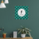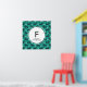 A poster designed with a repeating pattern featuring a cute smiling doggy with floppy ears and a dog bone. Green background. A white circle layered over top with a monogram initial and name inside. Cute poster for a pets corner or room.