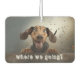 "Where we going?" text over a cute dog photo (can be changed to your dog) on a fun air freshener. An affordable gift for family, friends or create for yourself, they are double-sided and available in different shapes and several amazing long lasting, odour eliminating scents.