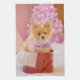Kitchen towel with an adorable Christmas dog wearing a cute pink plaid bow tie. This tiny little pet is sitting inside a whimsical hat box. A white tree decorated with pink lights in the background. The lights are blurred giving it a magical bokeh effect. Darling Christmas themed photograph. Perfect for dog lovers.