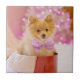 A ceramic tile with an adorable Christmas dog wearing a cute pink plaid bow tie. This tiny little pet is sitting inside a whimsical hat box. A white tree decorated with pink lights in the background. The lights are blurred giving it a magical bokeh effect. Darling Christmas themed photograph. Perfect for dog lovers.