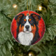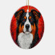 Dog's face set against a bold red circular background. The dog features distinct markings with black, brown, and white fur, and striking orange eyes, giving it an expressive and captivating look.