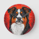 Dog's face set against a bold red circular background. The dog features distinct markings with black, brown, and white fur, and striking orange eyes, giving it an expressive and captivating look.
