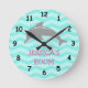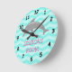 Cute gray dolphin and chevron pattern kids nursery wall clock. Sea animal vector design with turquoise blue zig zag background. Add your own personalized name of child. Unique babe shower or pregnancy gift idea for new baby and mom / parents. Custom home decor and decorations for childrens bedroom. Zigzag print with pink typography, fish and numbered dial plate.