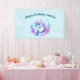 Birthday banner with an adorable illustration. A blue and purple dolphin surrounded by pretty colourful underwater plants.