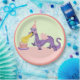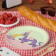 Creative dragon birthday party plates featuring funny purple and pink fires-breathing dragon blowing out the candles on a cute birthday cake. Add your text to personalise.