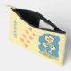 Sweet kid pencils pouch featuring a yellow duckling wearing eyeglasses and carrying a book on the front and a green and yellow striped pattern on the back . Personalise it with the child's name .
