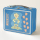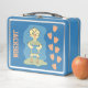 Gender neutral light blue lunchbox with an adorable yellow duck wearing big eyeglasses and holding a book . Orange duck footprints are shown on the right . Personalise it with the child's name using the template .