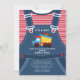 Dump Truck Baby Shower Invitation featuring the cutest pair of baby overalls with a red & white stripe shirt & a blue, yellow & red dump truck. Unique Boys baby shower invite for a truck themed baby shower for a baby boy.