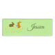 This awesome name tag features a pair of cute little Easter bunnies surrounded by yellow daffodil flowers. The rabbits are brown with big ears, black eyes and fluffy white tails. One of the bunnies is holding an Easter egg with a pretty purple bow on it and is reaching out to offer it to the other bunny. The daffodils are yellow with a bright orange centre.