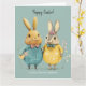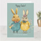 Cute Easter bunny couple greeting card. Wonderful spring colours in yellow and green / blue tones, a couple of super cute Easter bunnies in fancy clothes carrying eggs and spring flowers. Personalised text with a lovely trendy script.