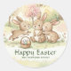 Make your Easter gifts look instantly special with this round watercolor bunny sticker. Three cuddly baby bunnies, blossom trees, and a little basket filled with pastel Easter eggs create the cutest spring vibe, and you can personalize the name for a thoughtful from our family touch. Great for sealing envelopes, decorating treat bags, party favors, egg hunt prizes, brunch place settings, and class gifts. A charming choice for bunny lovers, pastel spring themes, and whimsical woodland style.
