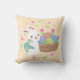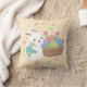 A cute illustration of a bunny holding an Easter egg in front of a basket filled with colorful Easter eggs