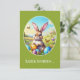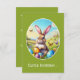 A cute Easter bunny with Easter eggs, in an idyllic landscape. Digitally created. Oval portrait format.
