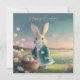 Cute Easter bunny in little blue jacket with easter egg basket in a field of wild flowers