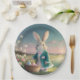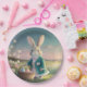 Cute Easter bunny in little blue jacket with easter egg basket in a field of wild flowers