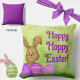 Make the season egg-stra magical with this cute, colourful Easter throw pillow featuring a sweet smiling cartoon bunny rabbit and purple eggs on a grassy green background. Text on pillow reads "Hoppy Hoppy Easter!" but may be customised with a message of your choosing. A charming spring accent for kids' rooms or dens, this pillow is sure to add cheer to your home! Pillow back is solid purple.