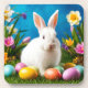 Adorable white bunny sitting among vibrant Easter eggs on fresh green grass, adorned with charming flowers and a cheerful blue background, capturing the spirit of springtime and Easter celebrations.