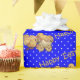A cute and cheerful blue polka dot pattern Easter wrapping paper featuring an adorable pattern of vintage Easter chicks pulling a cart made out of an easter egg, and covered with flowers. There is a pretty blue polka dot pattern behind them, and the words 'Happy Easter' scattered throughout.