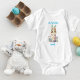 A baby bodysuit with a cute Easter egg bunny, all-personalizable text design, and an adorable Furry Easter bunny with eggs and flowers, as well as a little bunny bearing eggs on the back, with custom text and sizing ,ideal for newborn, first easter up to 18 months