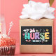 Colorful lettering with a nurse hat, stethoscope, flowers and playful medical symbols. A cheerful graphic celebrating caring nurses and healthcare professionals during the Easter season with a bright and friendly hospital atmosphere.