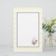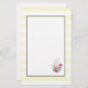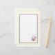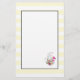 Stationery with a cute watercolor painting of a pale green egg sitting inside a wicker basket. Decorated with ribbons, bows, flowers and little hearts. A pink flamingo and white bunny rabbit by its side. Background is pale yellow and white stripes.