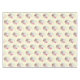 A patterned tablecloth with a cute watercolor painting of a pale green egg sitting inside a wicker basket. Decorated with ribbons, bows, flowers and little hearts. A pink flamingo and white bunny rabbit by its side.