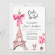 Cute watercolor Paris birthday party invitation features a watercolor Eiffel Tower, a cute French dog, macarons, and a shopping box with balloons. Personalize with your birthday information.