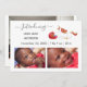 Simple, elegant and cute new baby announcement card with three photos, the texts "Introducing" + the newborn's name + his birth stats + "Welcomed with love by" + the names of the parents. Make sure you customise all the info. This card includes an illustration with a kneeling unicorn with golden and red glitter in his mane and tail and a cute little Brown baby with chocolate skin in a red bassinet.