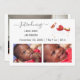Simple, elegant and cute new baby announcement card with three photos, the texts "Introducing" + the newborn's name + his birth stats + "Welcomed with love by" + the names of the parents. Make sure you customise all the info. This card includes an illustration with a unicorn with golden and red glitter in his mane and tail carrying a cute little Brown baby with chocolate skin in a red bassinet.