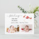 Simple, elegant and cute new baby announcement card with three photos, the texts "Introducing" + the newborn's name + his birth stats + "Welcomed with love by" + the names of the parents. Make sure you customise all the info. This card includes an illustration with a unicorn with golden and red glitter in his mane and tail carrying a cute little light-skinned baby in a red bassinet.