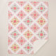 The cute and blanket combines floral and geometric patterns. Ethnic motifs such as lotus flowers, dots, and mosque-like shapes are decorated in sweet and soft colours such as pink, yellow, light blue, accented with red and green. Its combination of exotic motifs and pastel colours creates a warm and nostalgic atmosphere.