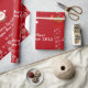Modern, elegant, and cute Christmas wrapping paper, with an an image of Santa Claus in his red suit (holding a candy cane) and one of Rudolph (wearing a Xmas hat), the text "Merry Christmas & Happy New Year 20YY" in stylish script / calligraphy handwriting, and a personalised name. With sprinkles of white and silver snowflakes, and a red ribbon and a pair of Xmas bells with a sprig of holly each.