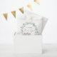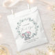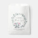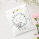 Cute baby girl shower favour bags featuring "A Sweet Little Thank You" in a mix of modern typography and a stylish script with a heart swash, and a watercolor of a pink baby elephant in a wreath of sage green eucalyptus greenery. Personalise with the mother-to-be's name and the shower date.