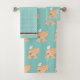 Fun bath towel set, with the bath towel done in aqua with cute peach coloured elephants all over. The hand towel is done in a aqua and white polka dot pattern, and the wash cloth is a solid aqua, with one large cute elephant. Sweet towel set for any young child's bathroom.
