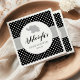 These black and white baby shower paper napkins feature a cute grey baby elephant silhouetted on a grey-bordered white circle. The name of the mother-to-be appears in black cursive script typography, with the words "Baby Shower" and the date below in dark grey. The black and white polka dot pattern background is bisected by a grey ribbon design with a dashed white border to simulate stitching.