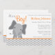 A modern grey and orange elephant themed baby shower invitation. Perfect for a little boy baby shower.