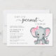 A cute baby girl couples shower invitation featuring "A Sweet Little Peanut Is On Her Way" in soft grey typography and a stylish swash script and a pastel pink watercolor of a baby girl elephant. Add the names of the mother and father and shower details in simple modern grey typography.