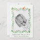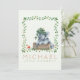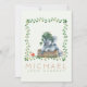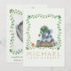 Our cute photo birth announcement card introduces your beautiful baby boy with his name on the front with soft watercolor green florals and a cute elephant and hamster. Customise the back with a newborn photo and script text to feature your baby's important birth information, and parent names. The photo is framed by a soft watercolor leaf frame.