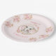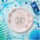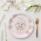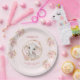 Paper plates with the cutest baby elephant in a golden circle and pink flowers, roses on the light pink background for 1st Birthday or any Birthday of a little girl. Easily personalise the text. - Kate Eden Art