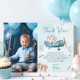 Personalise this cute aviation elephant double-sided photograph thank you card easily and quickly. Simply click the customise it further button to edit the texts, change fonts and fonts colours. Featuring a cute elephant riding a blue plane and a "thank you" headline.