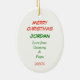This cute Christmas kids' ornament features an adorable watercolor grey elephant who wears green and red striped pajama bottoms and a red Santa hat. He offers a gift tied with a red ribbon. A red star shines above him, and a green and white tree bulb is at his knee. Your child's name is in red at the bottom. The back has four text fields in red and green for you to customise. Cute for a grandparent to give to a grandchild, or a parent to give to a daughter or son.