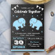Amaze your guests with this twins birthday party invite featuring adorable little elephants with vibrant elements against a chalkboard background. Simply add your event details on this easy-to-use template to make it a one-of-a-kind invitation. Flip the card over to reveal an elegant blue and white stripes pattern on the back of the card.