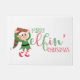 Unique Elf Merry Elfin Christmas Doormat featuring an adorable elf holding a gift with a modern hand lettered typography saying.